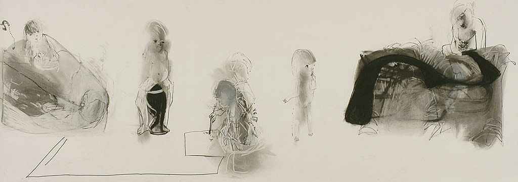 These very large drawings (8’ x 3’) were inspired by a love of Chinese scroll paintings. I used these drawings as a way of extending the theme of my children and the everyday, but also exploring the floating quality and use of the white space to intensify the images. This poetic use of space – of placing several figures in their own islands of space and time – has continued into the Swimming Paintings.